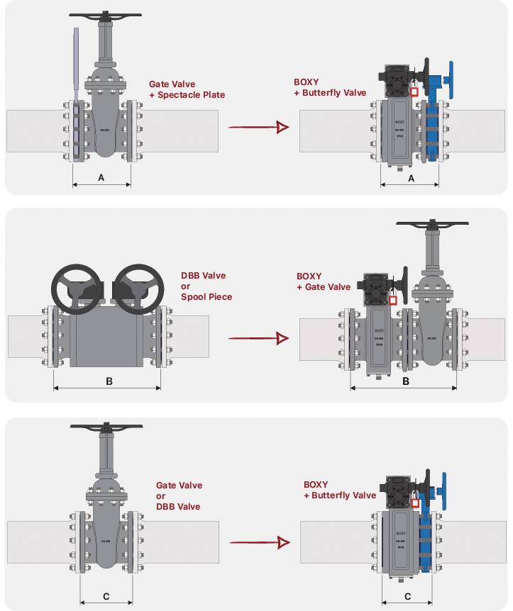 BOXYブラインドバルブはパイプを変更することなく、ゲートバルブ+スペクタクルプレート、ゲートバルブ、DBBバルブ、スプールピースなど、既存に設置された分離装備を代替することができます。 BOXYは設備の安全レベルを強化し、メンテナンス費用を減らします。