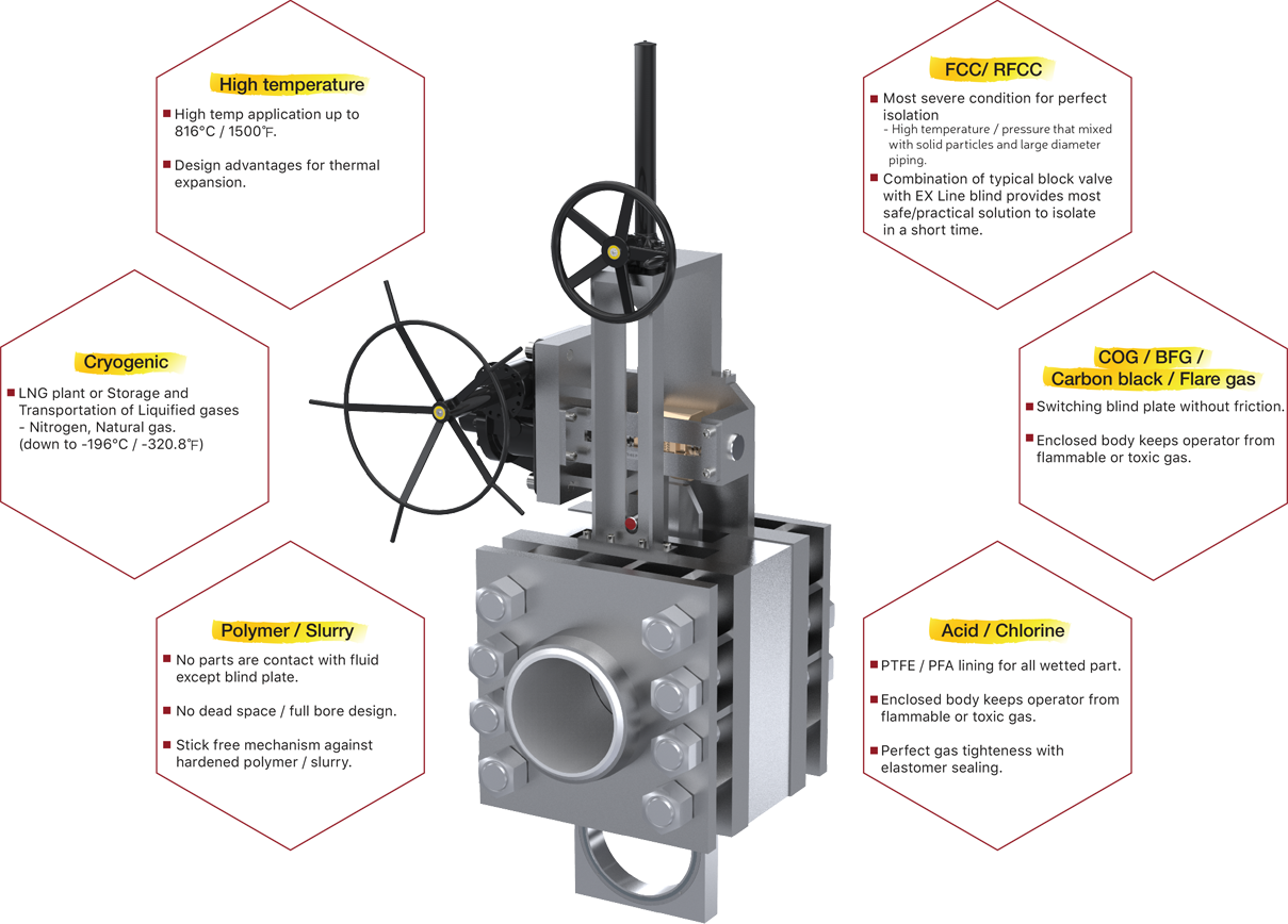 製品内部にガスケットがなく単純な構造を通じて極低温・高温の流体に対して接触面を最小化し、特別な作動構造(spreading mechanism)は隙間(gap)を作ってブラインドプレートの位置を素早く変更することができます。